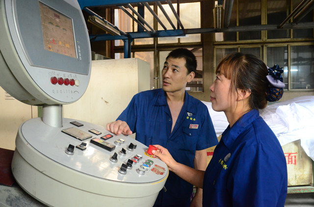 圖為面一車間拉幅預縮精益生產承包小組副組長孫新強(左)、預縮機機長郭芳,在預縮機操作臺前準備開車生產的情形。