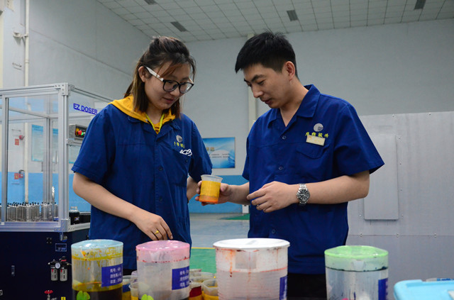 張?zhí)鹛穑▓D左)和張新華(圖右)二人,是多年來(lái)在公司花布車間從事專業(yè)技術(shù)工作的基層科技工作者,他們每天都為車間生產(chǎn)的印花產(chǎn)品精心調(diào)制著顏色。與其二人一樣,公司從事顏色調(diào)配的專業(yè)技術(shù)人員,每天都要完成一定數(shù)量的顏色調(diào)制;以花布車間為例,每人每天完成顏色調(diào)制在15-30個(gè)之間,并符合四級(jí)以上印花符樣標(biāo)準(zhǔn)。他們用自己的堅(jiān)守與付出,演繹著一道旖旎多彩的風(fēng)景線。
