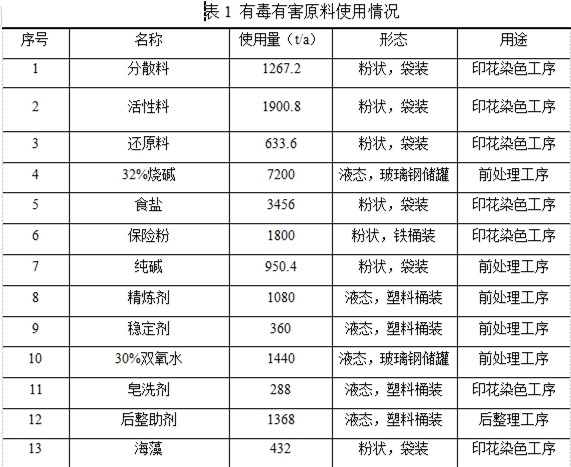 華紡股份有限公司現(xiàn)有項(xiàng)目使用的原料包括分散料、活性料、還原料、燒堿、保險(xiǎn)粉、純堿、精煉劑、穩(wěn)定劑等,其使用情況見(jiàn)表1。