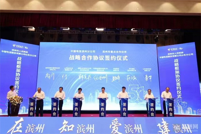 近日,濱州市人民政府與中國電信山東分公司戰略合作框架協議簽約儀式在濱州舉行。中國電信山東分公司黨委書記、總經理文勇,市委副書記、市長李春田共同為“天翼云濱州資源池”揭牌。會上,中國電信濱州分公司黨委書記、總經理任永剛與公司董事長盛守祥共同為“5G+智能紡織”項目揭牌。