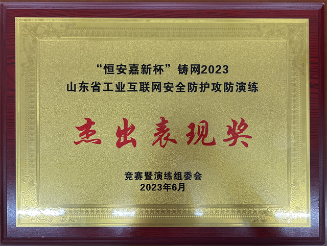 6月19日,由山東省通信管理局組織的“恒安嘉新杯”鑄網2023山東省工業互聯網安全防護技能競賽暨攻防演練在濟南舉辦,由公司信息中心組成的華紡隊以卓越的表現獲得由山東省通信管理局頒發的“杰出表現獎”。