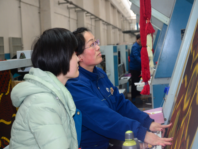 圖為袁麗霞為新員工孫紅艷傳授驗布經(jīng)驗。